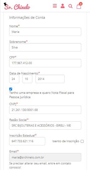 - INFORMAÇÕES DE CONTA Nessa opção você encontra seus dados: nome completo, CPF, data de nascimento e e-mail. Caso você tenha uma empresa e deseja que a Nota Fiscal seja para Pessoa Jurídica, é aqui que estarão os dados como CNPJ, Razão Social e Inscrição Estadual.