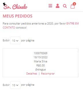 No site Sr. Chinelo clique em Minha Conta, que fica no topo da página e depois em Meus Pedidos. Nessa página você tem acesso a todas as compras que foram realizadas em nosso site e é nela que você poderá consultar todas as informações de seus pedidos. Localize o pedido que deseja rastrear e clique em Detalhes. Ao abrir o pedido, localize o quadro Forma de Entrega e clique em Rastrear seu Pedido.