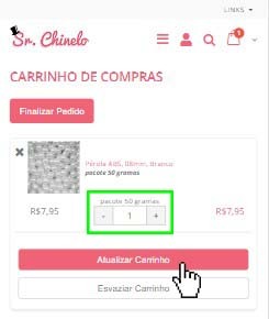 Se quiser alterar a quantidade de algum item, use os símbolos de +ou de + para alterar e clique em ATUALIZAR CARRINHO. Se quiser remover algum produto, clique no ícone X ao lado esquerdo do produto.