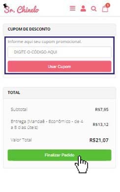 • FINALIZAR A COMPRA Quando desejar finalizar seu pedido, vá para seu carrinho de compras. Adicione o CEP de seu endereço, clique em CALCULAR e escolha o método de envio, conferindo os prazos de entrega e os valores. Caso você tenha algum cupom de desconto, insira-o no campo CUPOM DE DESCONTO e clique em USAR CUPOM. Verifique na soma de valores o valor total de sua compra e clique em FINALIZAR PEDIDO.