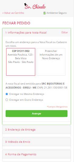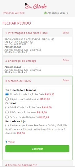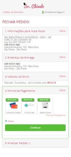 A forma de pagamento é escolhida e efetuada no próprio site do Sr. Chinelo, de maneira completamente segura.