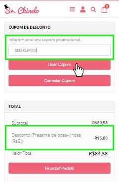 Cupom de desconto é um código a ser utilizado em seu carrinho de compras, para ganhar algum tipo de desconto ou participar de alguma promoção. Após aplicar o cupom, o desconto aparecerá abaixo do subtotal do seu pedido, no carrinho de compras.